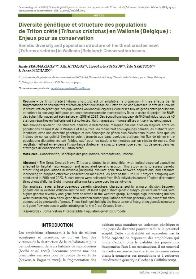 Diversité génétique et structure des populations de Triton crêté (Triturus cristatus) en Wallonie (Belgique) : Enjeux pour sa conservation. Beaumariage et al., 2025