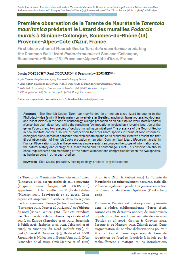 Première observation de la Tarente de Maurétanie Tarentola mauritanica prédatant le Lézard des muraillesPodarcis muralis à Simiane-Collongue, Bouches-du-Rhône (13), Provence-Alpes-Côte d’Azur, France. Doelsch et al., 2025