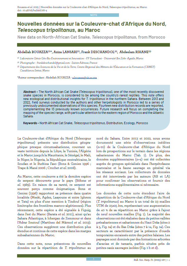 Nouvelles données sur la Couleuvre-chat d’Afrique du Nord, Telescopus tripolitanus, au Maroc. Bouazza et al., 2025