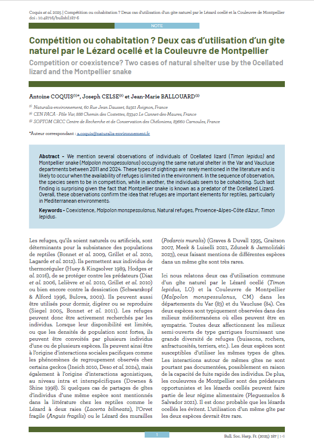 Compétition ou cohabitation ? Deux cas d’utilisation d’un gite naturel par le Lézard ocellé et la Couleuvre de Montpellier. Coquis et al., 2025