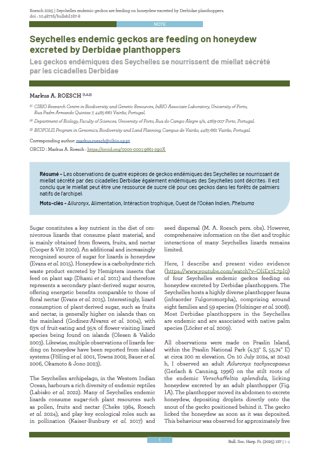Seychelles endemic geckos are feeding on honeydew excreted by Derbidae planthoppers. Roesch, 2025