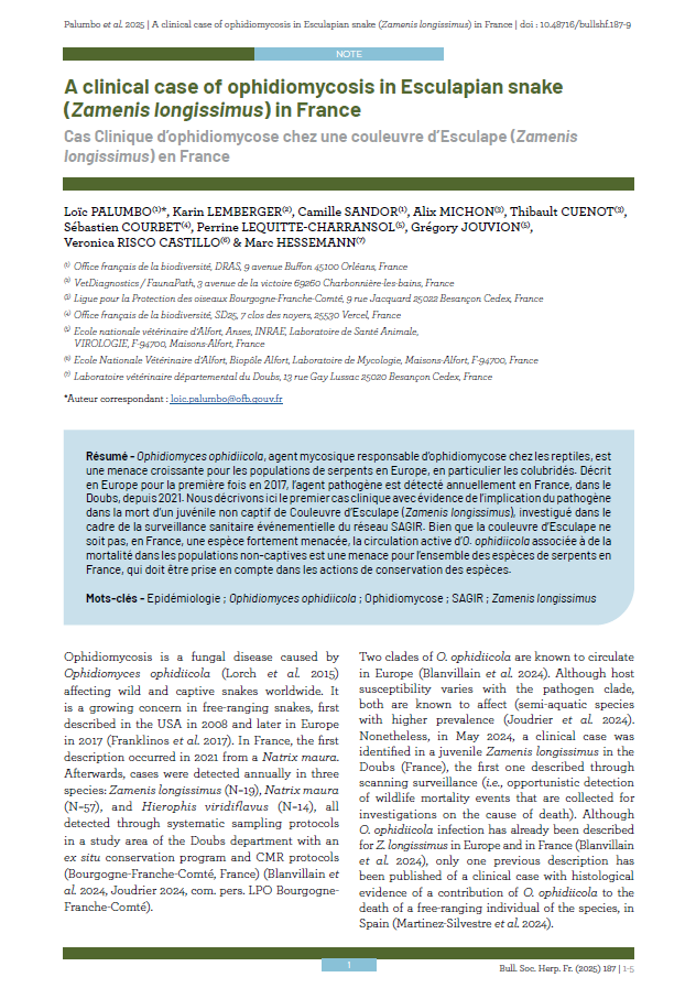 A clinical case of ophidiomycosis in Esculapian snake (Zamenis longissimus) in France. Palumbo et al., 2025