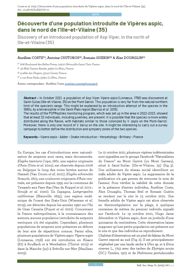 Découverte d’une population introduite de Vipères aspic, dans le nord de l’Ille-et-Vilaine (35). Coste et al., 2025
