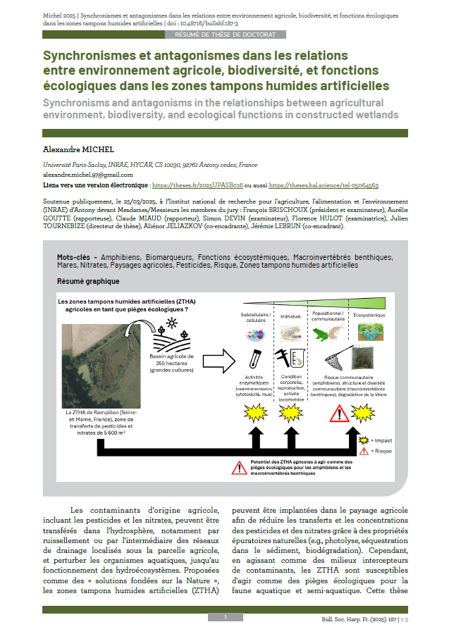 Synchronismes et antagonismes dans les relations entre environnement agricole, biodiversité, et fonctions écologiques dans les zones tampons humides artificielles. Michel, 2025