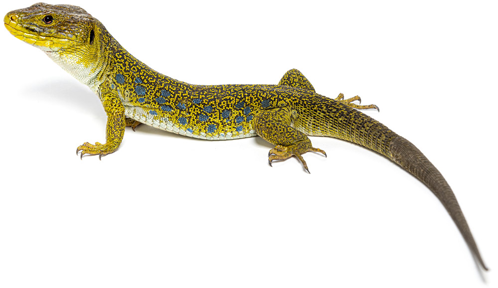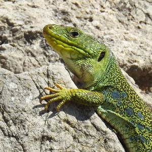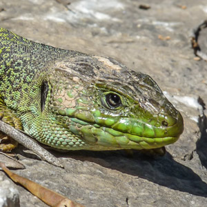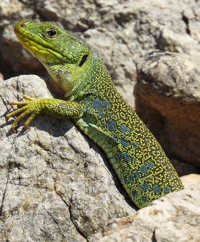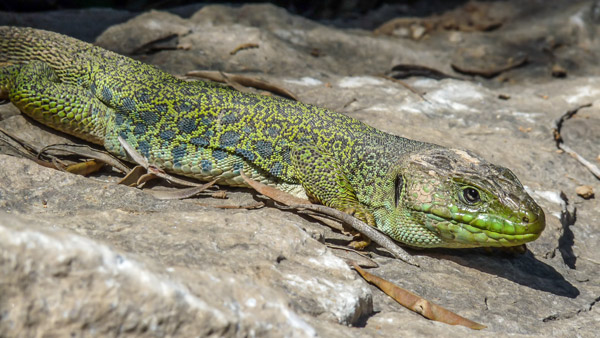 Le Lézard ocellé (Timon lepidus) est l’un des plus grands lézards d’Europe, remarquable par ses couleurs vives et ses motifs distinctifs en forme d’ocelles bleus. Malgré son apparence robuste, il est fortement impacté par la destruction et la fragmentation de ses habitats, notamment dans les milieux ouverts et ensoleillés.