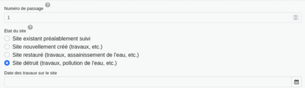 Une fois cette information renseignée, il est inutile de retourner sur ce site lors des passages suivants. Il conviendra plutôt de tenter de trouver un autre site potentiellement favorable aux amphibiens dans l’aire considérée. Le site peut par ailleurs être réintégré au suivi s’il bénéficie d’une restauration (même plusieurs années après). Vous pourrez alors renseigner, là encore, à travers le premier passage, la restauration du site et la date (si connue) des travaux effectués.