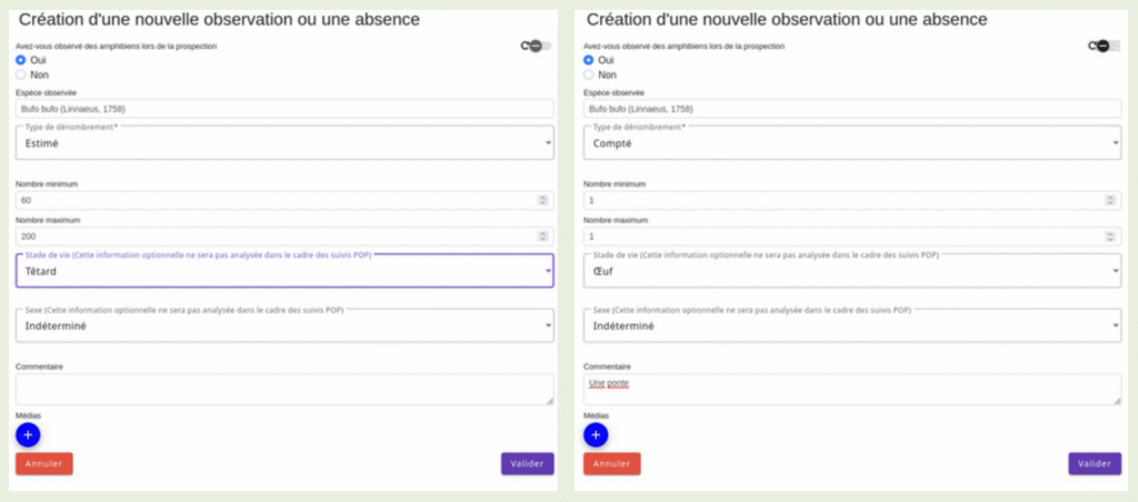 Dans le stade de vie, vous pouvez sélectionner : « oeuf » : ce stade de vie est à comprendre comme un nombre de pontes comptées ou estimées. « tétard » : ce stade de vie est à comprendre comme un nombre de têtards, et sera donc souvent une estimation.