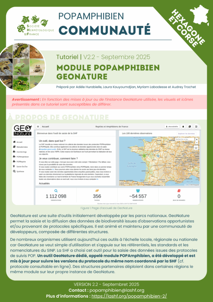 Désormais, la saisie des données POPAmphibien se fait quasi-exclusivement sous GeoNature. Nous n’accepterons bientôt plus la réception de données sous format Excel. Reportez-vous au tableau disponible sur https://lashf.org/popamphibien-2/, onglet “Présentation”, pour savoir sur quelle plateforme GeoNature vous êtes invité à saisir vos données (en fonction de votre localisation).